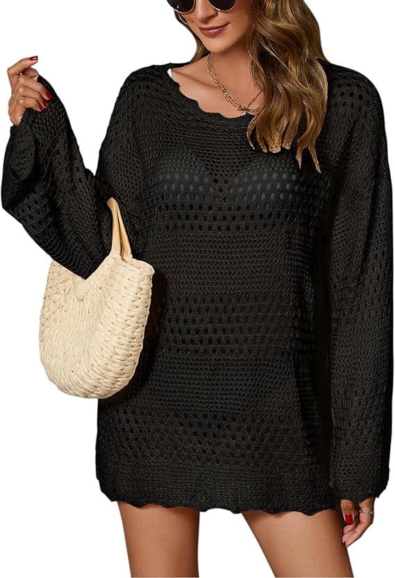 Crochet Swim Cover Up Knitted Hollow Out Long Sleeve Swimsuit Coverup Womens Beach Cover Up