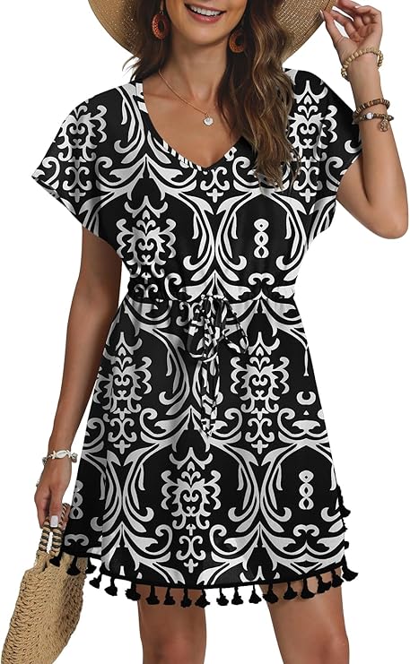 Women's Swimsuit Coverup Casual V Neck Beach Dress Short Sleeve Elastic Waist Swim Cover Ups 2024 Beachwear