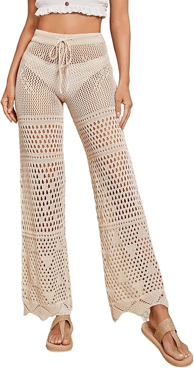 Women's Cover Up Pants Drawstring Crochet Knitted Sheer Beach Cover Up Pants Swimwear
