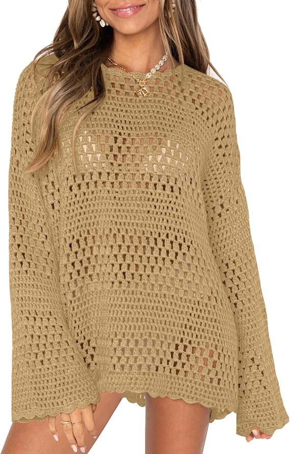 Beach Crochet Cover Ups for Women Hollow Out Swimsuits Cover Up Long Sleeve Mesh Knit Bathing Suit Coverups