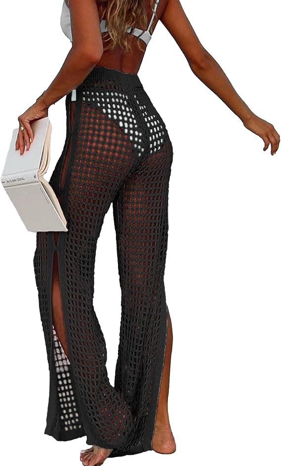 Women's Beach Cover Up Pants Hollow Cut Drawstring Elastic High Waist Bathing Suit Mesh Sheer Wide Leg Pant