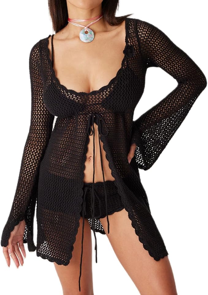 Women's Crochet Bikini Cover Up Knit Dress Long Sleeve Sexy Bathing Suit Swimsuit Coverup Dresses