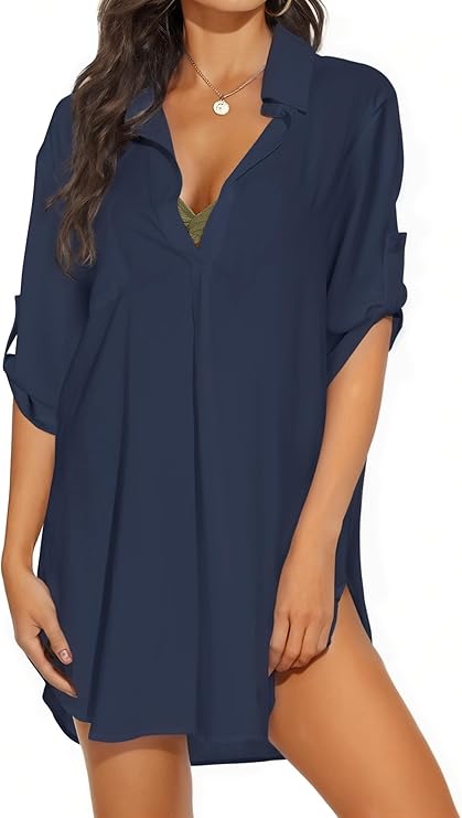 Womens Swimsuit Cover up Shirts Long Sleeve Button Down Bikini Beachwear Dress Loose Bathing Suit Cover Ups