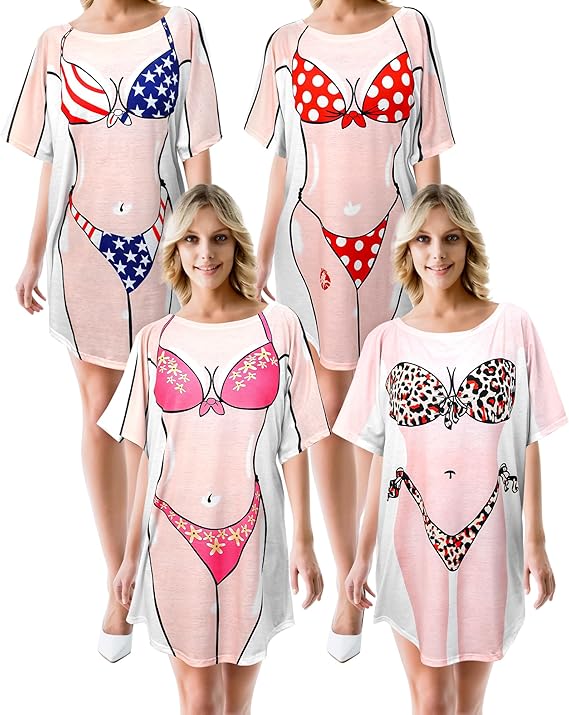 4 Pcs Women's Bikini Cover up Shirt Short Sleeve Bikini Print Dress Funny Swimsuit Baggy Shirt Swimwear for Women