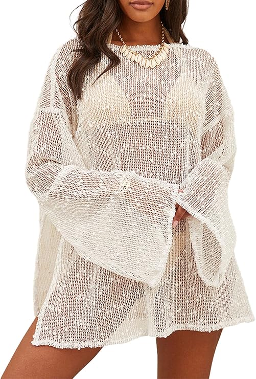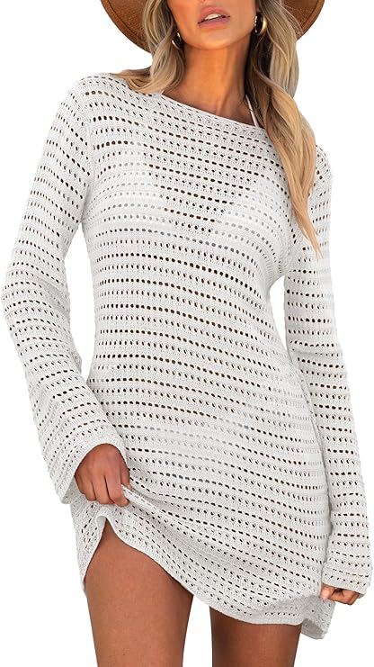 Crochet Swimsuit Coverup for Women Long Sleeve Swim Cover Up Hollow Out Knitted Bikini Beachwear