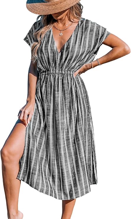 Women's Cover Up V Neck Midi Dress Short Sleeves Summer Beachwear Casual Coverups Striped XS-XXL