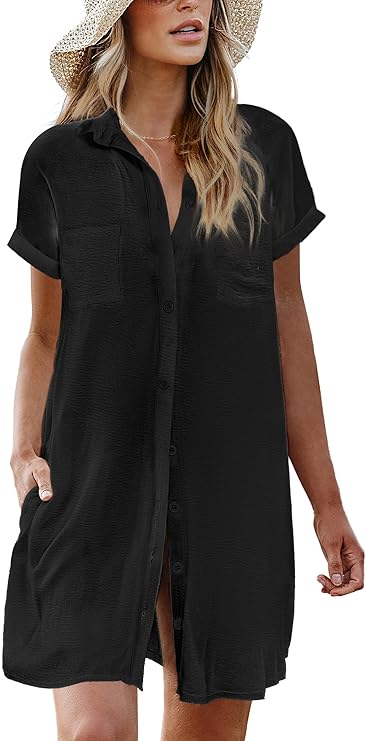 Womens Bathing Suit Cover Ups Summer Shirt Dress Casual Short Sleeve Button Down Beach Shirts with Pockets S-XXL