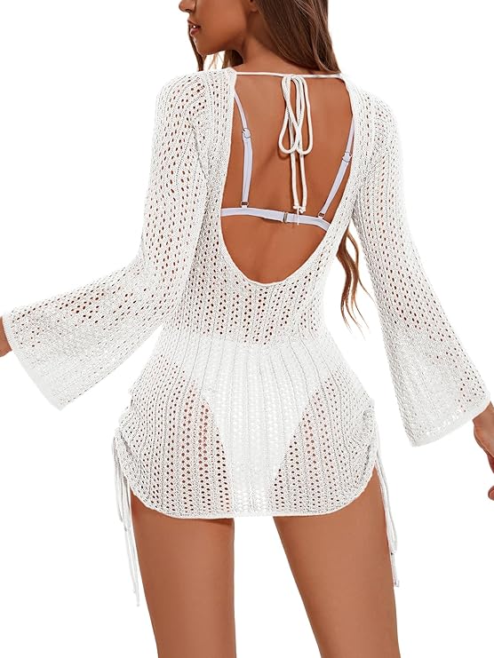 Women Crochet Cover Up Long Sleeve Swimsuit Bathing Suit Bikini Beach Hollow Out Cover Ups Swimwear