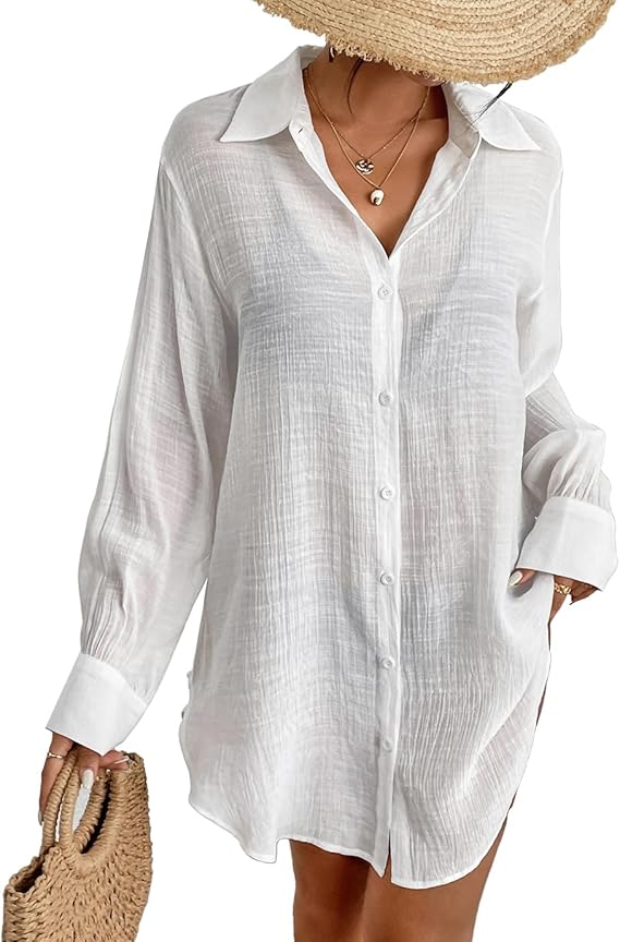 Women’s Button Down Shirts V-Neck Long Sleeve Bikini Bathing Suit Cover Up Plus Size Causal Blouse Beachwear