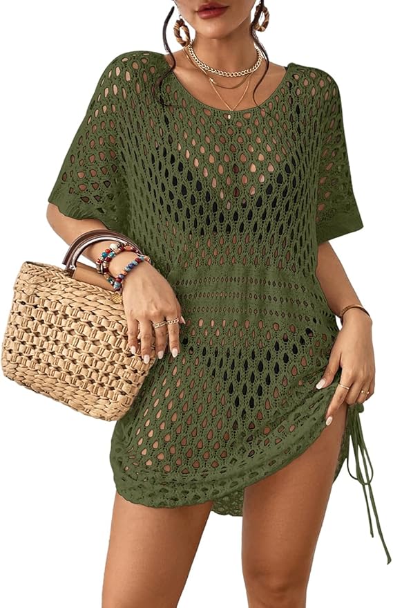 Crochet Cover Ups for Women Hollow Out Knit Bikini Swimwear Swimsuit Cover Up Beach Dress Drawstring