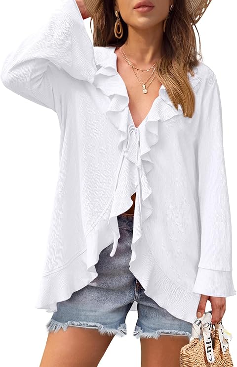 Women's 2024 Tie Front Ruffle Blouse Top Casual Loose Long Sleeve Kimono Bathing Suit Beach Cover Ups