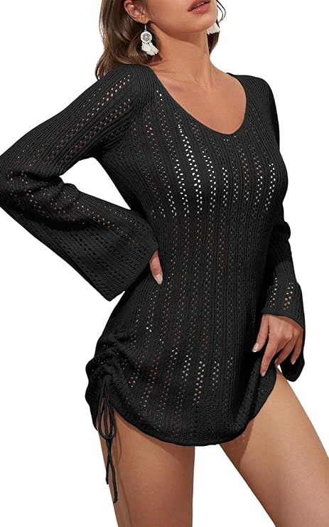 Women's Swimsuit Crochet Cover Up Knit Bathing Suit Swimwear Coverup Long Sleeve Drawstring Beach Dress
