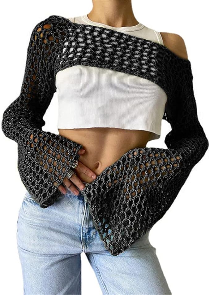 Women Mesh Crochet Crop Top Long Sleeve Hollow Out Cropped Knit Sweater Bikini Beach See Through Cover Ups